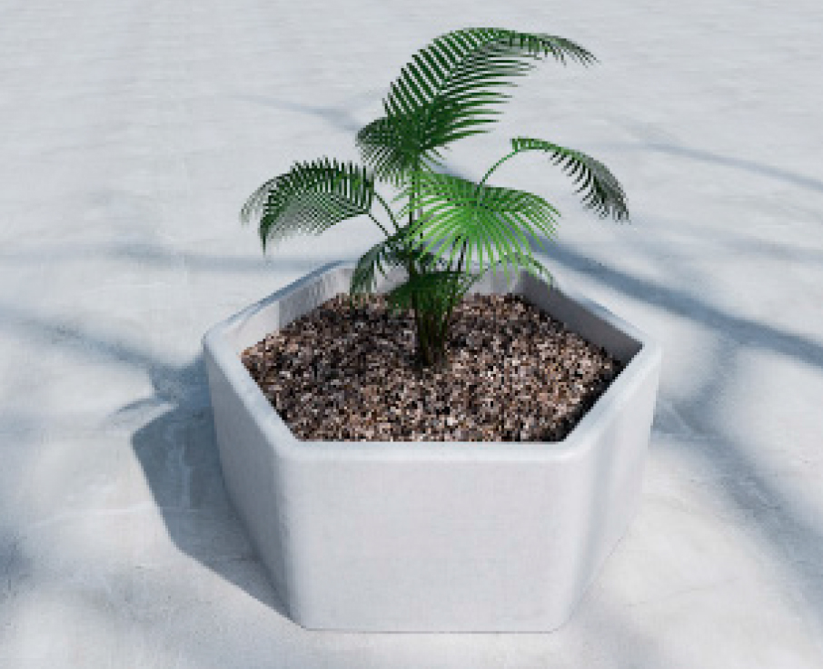 Jardinera en hormigón con formato hexagonal, de 250 Kg. de peso. Esta jardinera tiene una forma que está indicada para espacios exteriores, públicos o privados.
