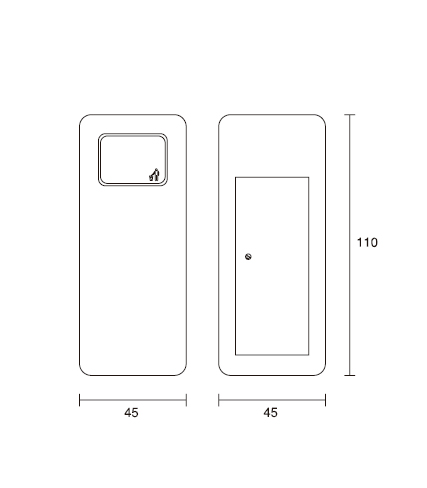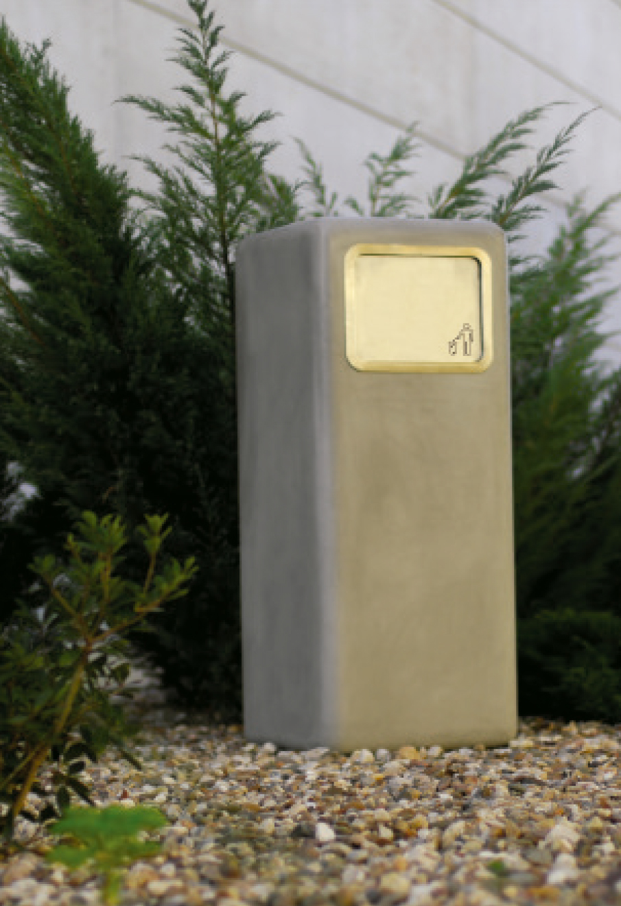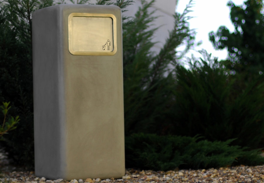 Papelera de 65 Kg. de peso en hormigón reforzado con fibra con acabado en color natural o pintada en color a elección. Es una pieza de diseño minimalista con aristas orgánicas. Papelera cubierta con la zona de entrada de residuos con pieza rotativa en inox. En el interior existe una caja metálica para depósito de los residuos, siendo que el mantenimiento es hecho por puerta trasera también en inox..