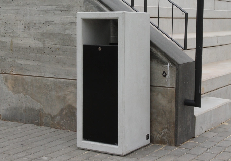 Papelera compuesta por aro en hormigón y chapa metálica lacada en las zonas frontal y trasera. El mantenimiento se realiza por la pieza metálica frontal que se mueve. Tiene un peso de 125 Kg, Muy indicada para espacios exteriores, públicos y privados.