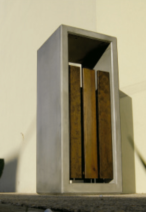 Papelera compuesta por aro en hormigón y listones de madera en las zonas frontal y trasera. Tiene un peso de 125 Kg. El mantenimiento es hecho por la zona de listones frontal que bascula. Es una pieza de mobiliario urbano muy indicada para espacios exteriores, públicos y privados.