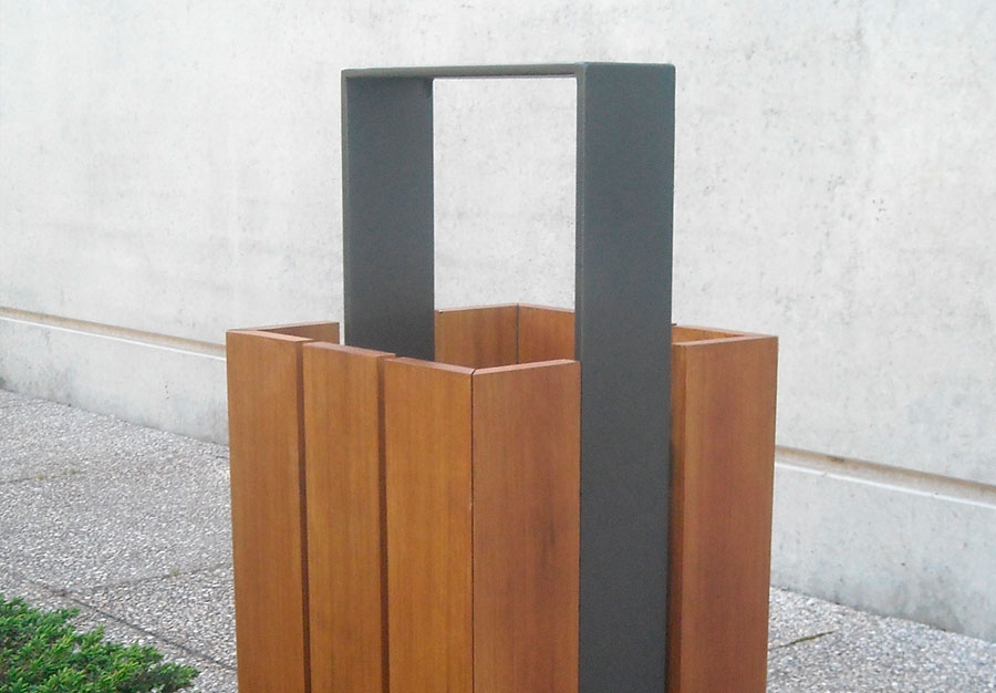 Papelera compuesta por listones de madera verticales que abrazan una estructura metálica central. Esta pieza de mobiliario urbano tiene un peso de 20 Kg.